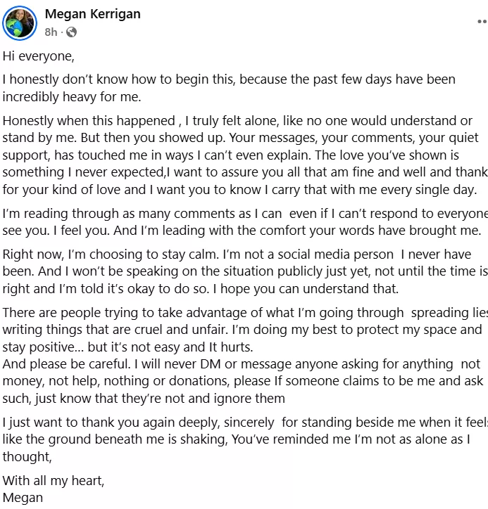 The authenticity of Megan Kerrigan’s statement cannot be confirmed, and it’s also worth mentioning that while she earlier had a profile, the recently surfaced Facebook wall is a page. However, the statement, which has been claimed to be from Megan, features a thank-you note for all the well-wishers and supporters who backed her during this testing time.