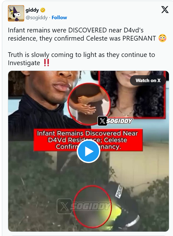 Unconfirmed reports claim that investigators uncovered evidence indicating Celeste had “a kid on the way.” Online speculation intensified after rumors spread that remains of an unborn child or infant were allegedly discovered near the Hollywood Hills home of artist D4vd, real name David Anthony Burke.