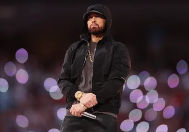 Feb 13, 2022; Inglewood, CA, USA; Eminem performs during the halftime show for Super Bowl LVI between the Los Angeles Rams and the Cincinnati Bengals at SoFi Stadium. Mandatory Credit: Mark J. Rebilas-USA TODAY Sports via Imagn Images