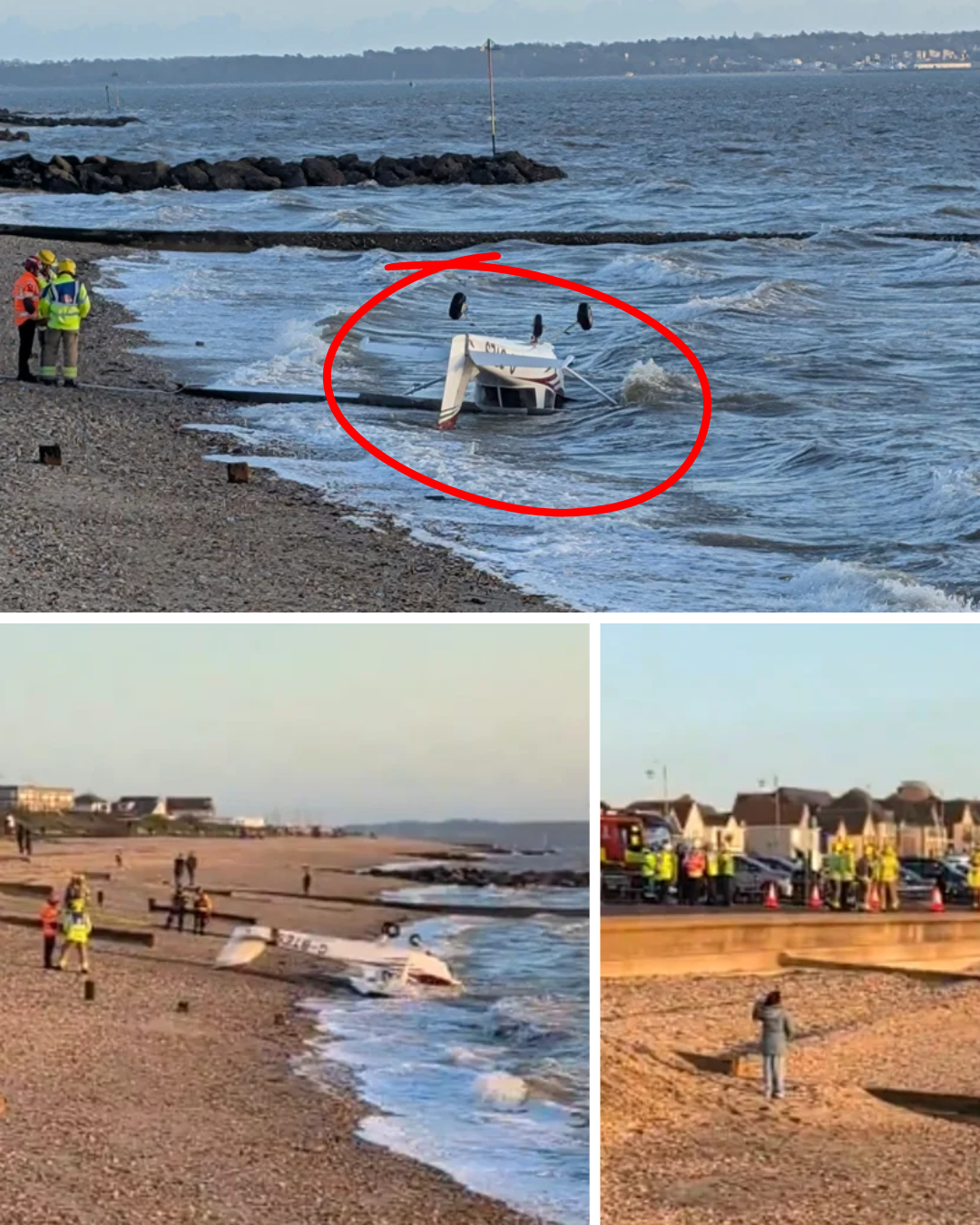 The small plane struck the water at approximately 4:15pm on Saturday, coming down just feet from the shingle shoreline, with the pilot managing to escape the wreckage and survive.
