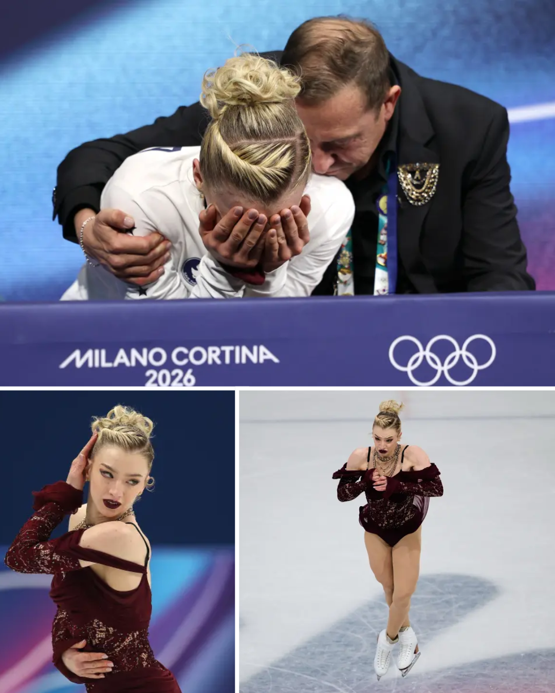 Amber Glenn is consoled by her coach in the Kiss and Cry zone at the Milano Cortina 2026 Winter Olympics.