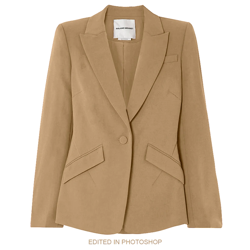Here are the stock images for the burgundy suit (which was available ready-to-wear), edited to look camel in Photoshop: