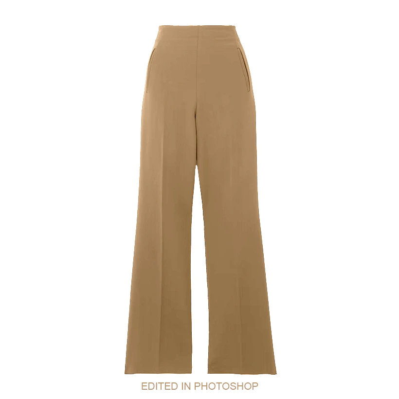 The trousers skim the floor, feature a crease down the front and have a slight flare.