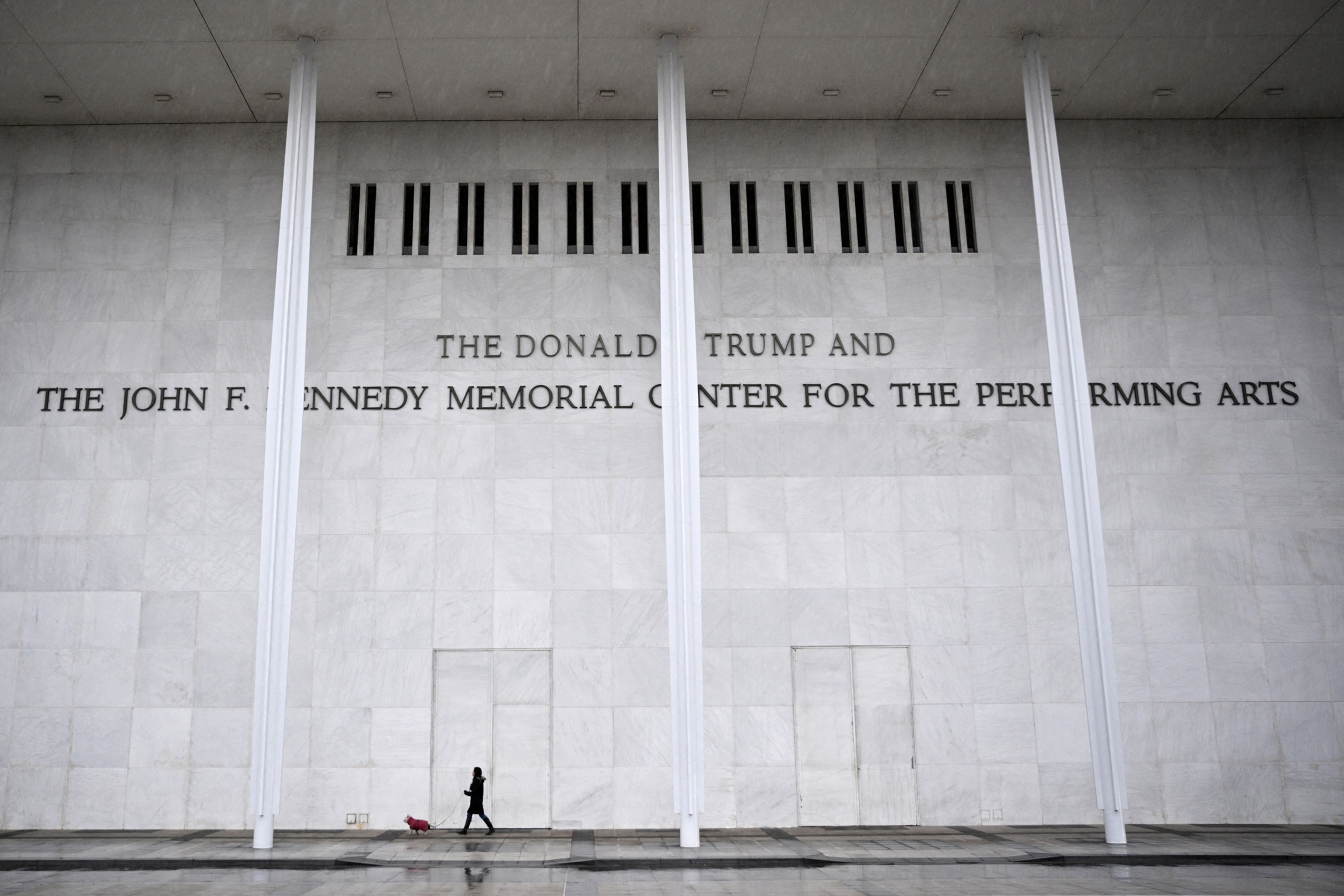 In this Jan. 1, 2026, file photo, a person and a dog walk in front of the Kennedy Center in Washington, D.C. Mandel Ngan/AFP via Getty Images, FILE